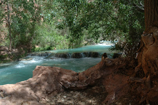 Havatsu creek, Recreational Equipment Inc. (REI) campground, Havatsu Indian Reservation NW AZ. Although the outside temperature was in the 80’s the water was very cool (maybe 70 degrees) because of loss of heat descending down the falls and across the rocks. 5/2008