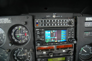 Cockpit instrument rack as viewed from the pilot’s seat in an instrument flight rules equiped (IFR) Cessna 182, N8189G. On left of center there is clockwise from upper left : the altimeter, the two very-high frequency omni directional receivers (VOR) course deviation needles. These are tuned from the frequencies set in radios stacked in the second level on the middle (above the required transponder which identifies the aircraft to flight controllers. Finally finishing the trip around the circle there is the vertical speed indicator. On the right of center there is…moving down from the top from left to right .. the left fuel tank fuel indicator, ammeter, right fuel tank fuel indicator. Then on the row below that, again moving left to right …cylinder head temperature, oil temperature, and oil pressure . Below that the circular gages indicate engine manifold pressure and engine revolutions per minute (RPM) gage respectively . Note the Garmin Global Positioning Satellite (GPS) 300 receiver directly below the radio switch panel. Its moving map display allows for much better display of map and other routing information for a single pilot than previously.
